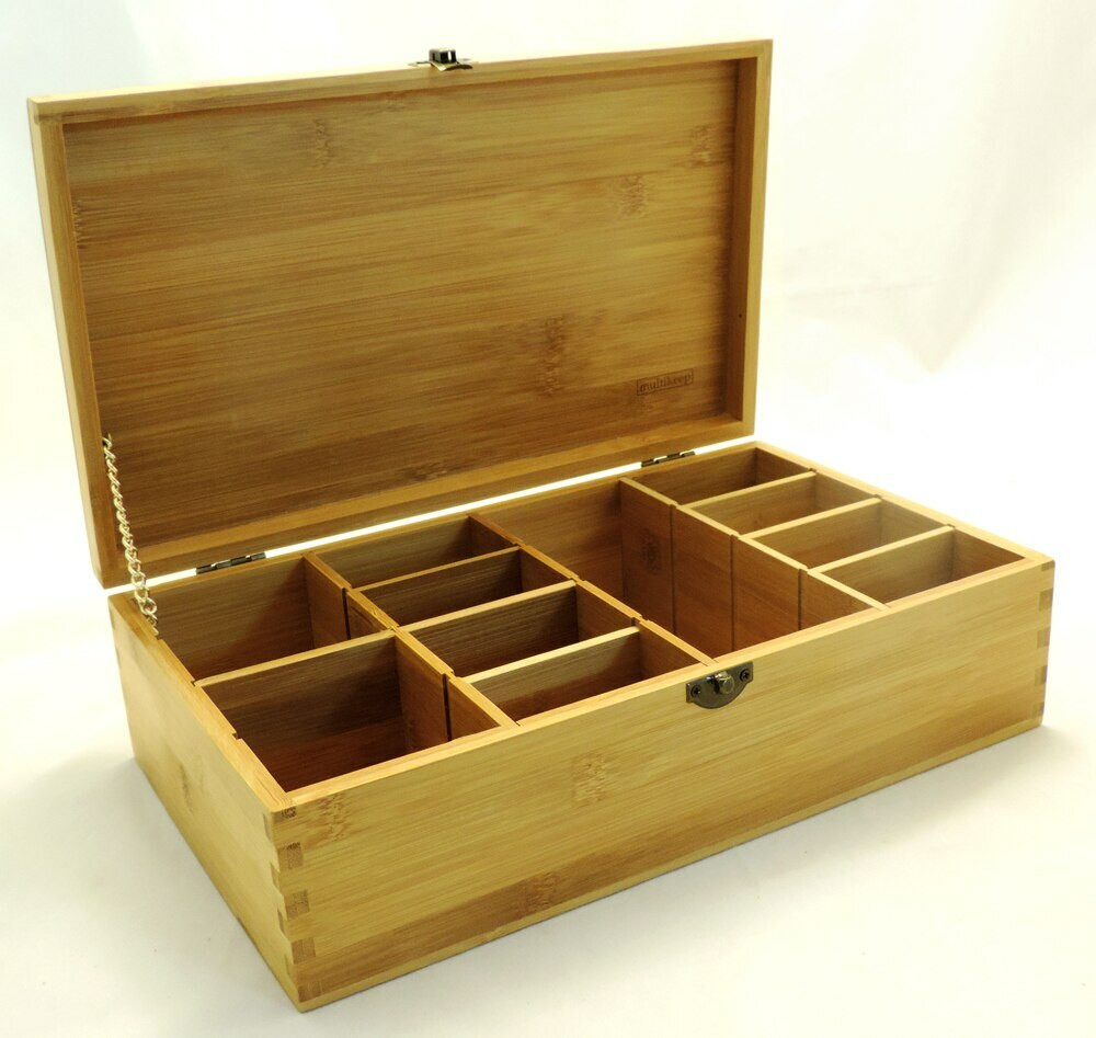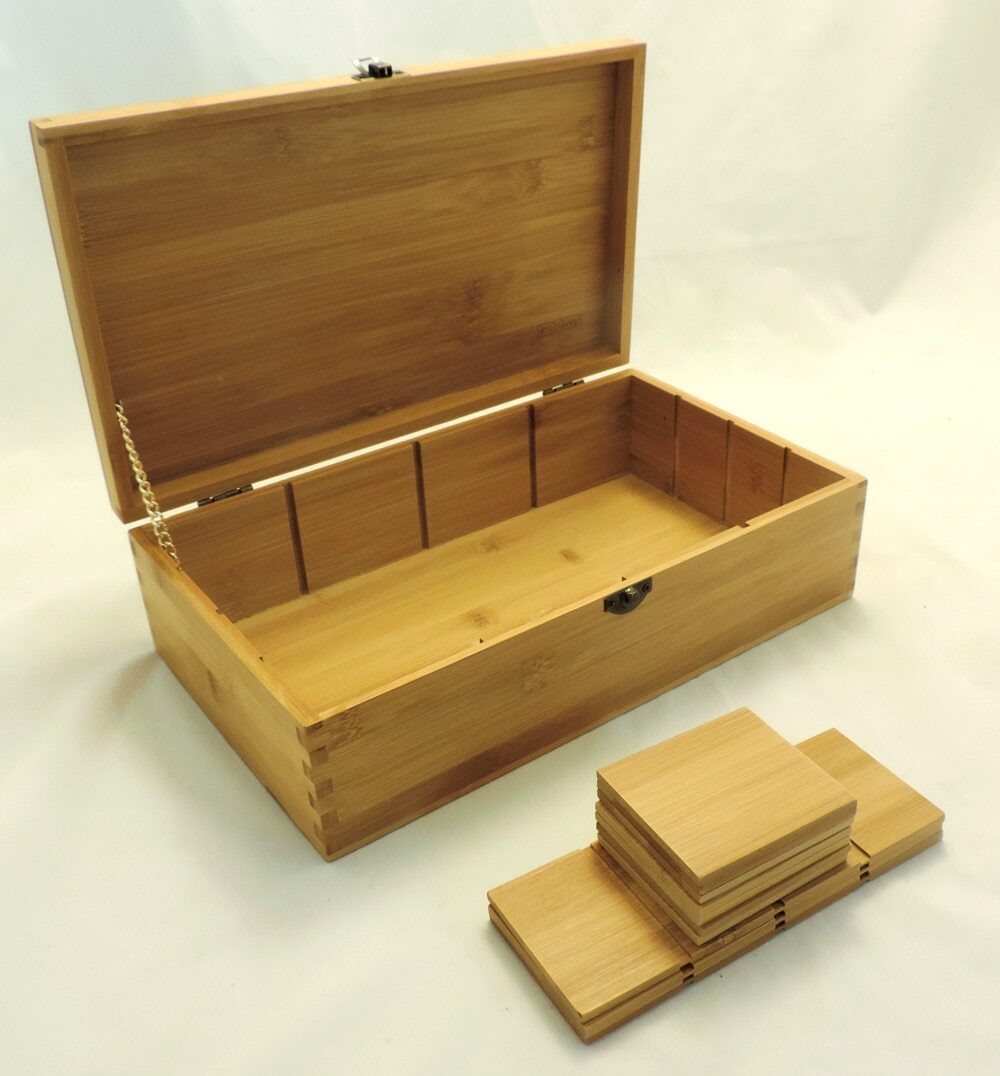 This box has a slide-out (not glued) removable 8-compartment divider, making it versatile box for storing gifts, keepsakes, tea bags or odds and ends! We engrave these boxes here Boise, Idaho, USA. The delightful honey color of Bamboo is produced entirely naturally, without the use of stain or paint.