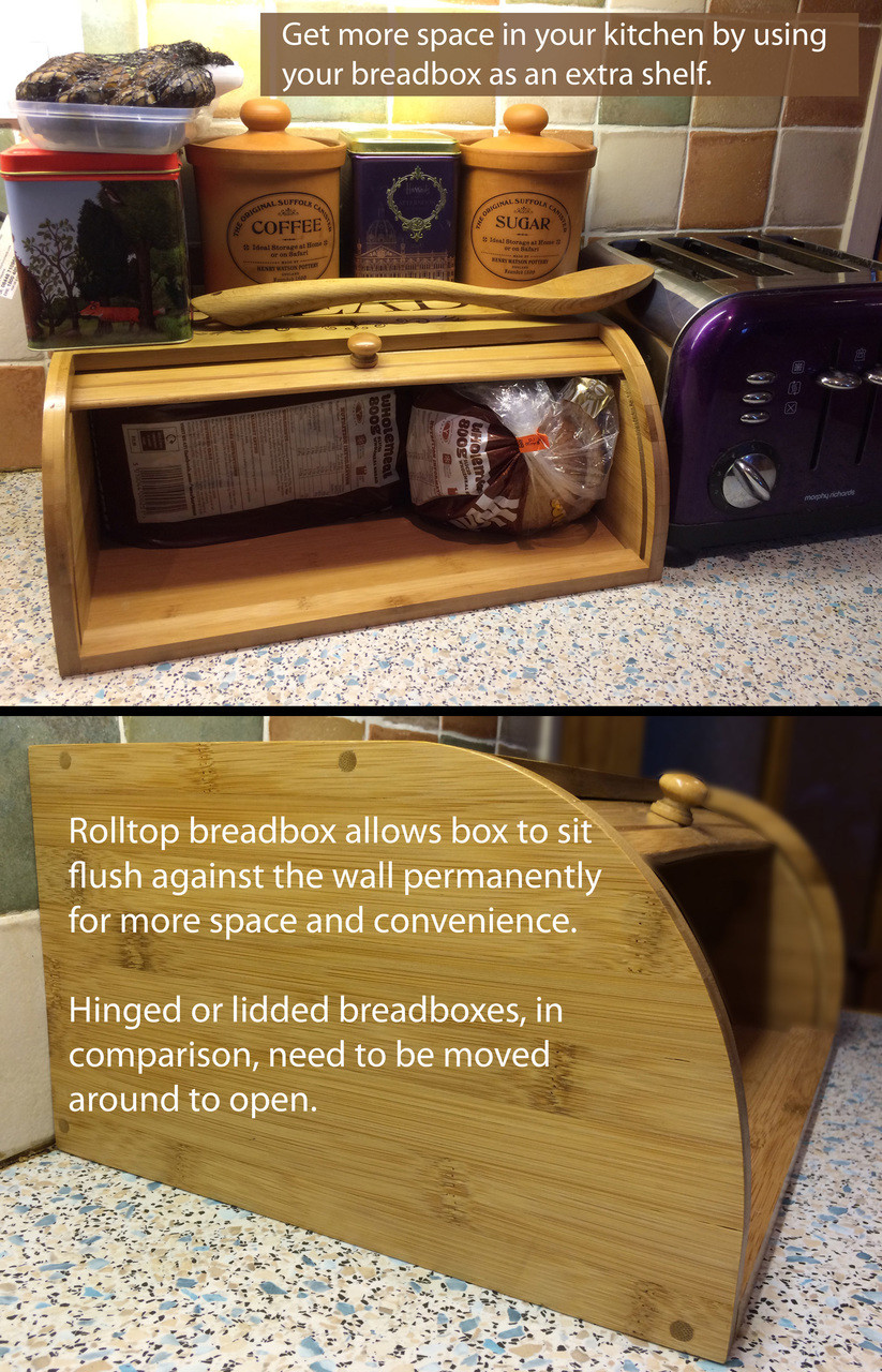 This is a really nice roll-top bread box that is only available here at CookbookPeople.com, because we do the custom design work on the top ourselves here in Boise, Idaho, USA. The delightful honey color of Bamboo is produced entirely naturally, without the use of stain or paint, through a special heating process that caramelizes the sugar in the wood. This is made bamboo, a wood that is a naturally replenishing grass and one of the world's most renewable resources. Dimensions: 15-3/4-inch by 10-3/4-inch by 6-3/4-inch. Extreme changes in temperature, humidity and dryness effect wood; store away from heat and sunlight in a well-ventilated spot. Wipe clean with mild soap and water and dry thoroughly; rub occasionally with mineral oil to maintain appearance.